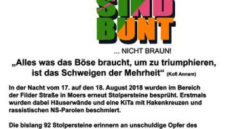 In der Nacht vom 17. auf den 18. August 2018 wurden im Bereich der Filder Straße in Moers erneut Stolpersteine besprüht. Erstmals wurden dabei Häuserwände und eine KiTa mit Hakenkreuzen und rassistischen NS-Parolen beschmiert. Die bislang 92 Stolpersteine erinnern an unschuldige Opfer des NS-Regimes. Mit ihnen lernen wir aus der Geschichte. Dies ist wesentlich für eine demokratische und friedliche Zukunft in unserer Stadt.