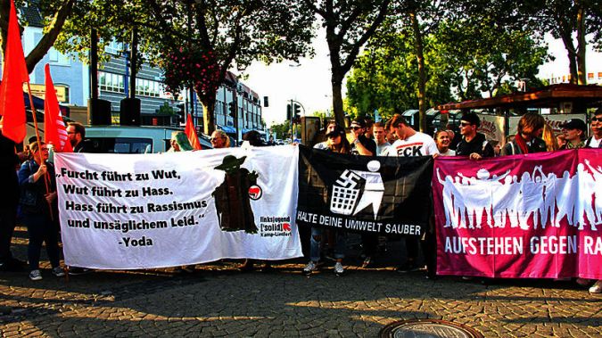 Angeschlossen an den Aufruf hatte sich der Verein „Erinnern für die Zukunft“, der wegen die Beschmierung von Stolpersteinen und den Nazi-Schmierereien vom 17./18. September zum Protest aufgerufen hatte.