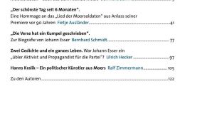 Der Band enthält zudem eine „Hommage an das Lied der Moorsoldaten aus Anlass seiner Premiere vor 90 Jahren“ von Fietje Ausländer. Dazu biografische Essays: Über Johann Esser, den Bergmann und Dichter des Moorsoldatenliedes schreiben Bernhard Schmidt und Ulrich Hecker. Den aus Moers stammenden Moerser Grafiker und Maler, der im KZ Börgermoor das weltweit bekannte Blatt mit Text und Melodie des Moorsoldatenliedes geschaffen und aus dem Lager geschmuggelt hat, stellt Ralf Zimmermann vor.