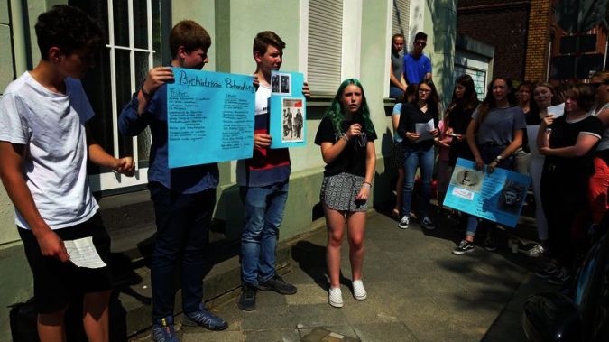 Schülerinnen und Schüler der Klasse 9b des Gymnasiums in den Filder Benden erläuterten anhand von Plakaten Grundsätzliches zur Euthanasie sowie die Unterschiede in der Krankenpflege und Förderung behinderter Patienten der damaligen Zeit gegenüber heutigen Behandlungsmethoden, wobei sie auch explizit auf die Lebens- und Leidensgeschichte Wilhelm J. Küsters eingingen. Für die anwesenden Neffen und Familienangehörigen war es ein bewegender Moment.