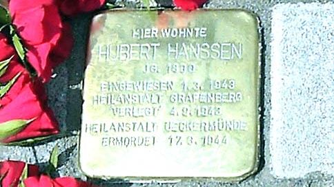 Hubert Hanßen, geboren 1890, wohnte in der Filder Str. 36, heute existiert nur noch Nr. 34. Er arbeitete lange Jahre als Oberkellner in der damaligen „Börse“ am Moerser Altmarkt. Später erkrankte er an Parkinson oder auch – das ist nicht geklärt – an Demenz und konnte deshalb seinen Beruf nicht mehr ausüben. Am 1.3.1943 wurde er in die Heil- und Pflegeanstalt Düsseldorf-Grafenberg eingewiesen. Nach einem Zwischenaufenthalt in Süchteln-Johannistal brachte man ihn am 4.9.1943 in die Anstalt Ueckermünde in Mecklenburg/Vorpommern, wo er am 17.3.1944 ermordet wurde. Die Urne mit Hubert Hanßens Asche wurde seiner Frau und seinem Sohn ohne Vorankündigung und ohne weitere Erklärung zugestellt.