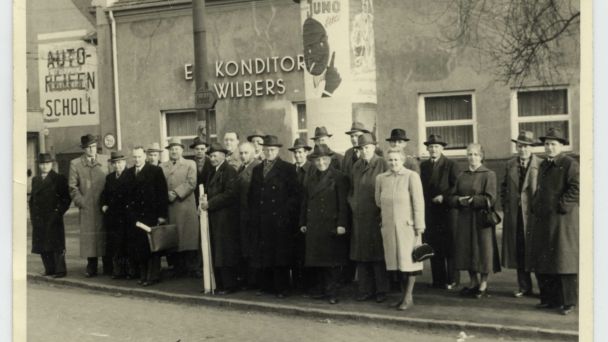 - Linke Politiker in der ersten Sitzung des Moerser Kreistags nach dem Krieg – nahezu alle zuvor verfolgt, v. links: Hermann Runge (später Parlament. Rat und Bundestag), Otto Schulenberg (später BM Rheinhausen), Hugo Josef Simecek (Landrat 1948-1953), Wilhelm Kever, Richard Buchmann, Dr. Hilmar Evora